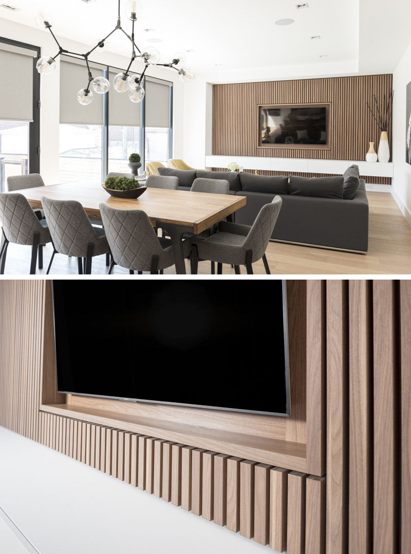 RZ INTERIORS có trụ sở tại Toronto đã thiết kế một bức tường tính năng hiện đại và tối thiểu cho căn phòng gia đình này, điều này sẽ giúp bạn đạt được một cảm giác bình tĩnh đơn giản, chứ không phải là một bức tường truyền hình lộn xộn và áp đảo.